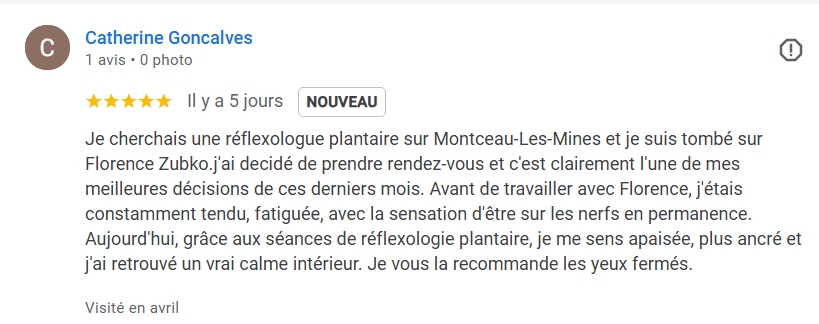 Florence m'a soulagée efficacement à plusieurs reprises par réflexologie plantaire. Je l'apprécie beaucoup pour sa capacité à mettre les clients à l'aise avec simplicité et humilité, son écoute et son empathie, ses explications claires et ses conseils judicieux.