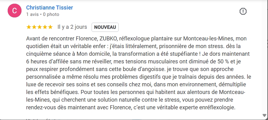Je conseil Florence, les séances de réflexologie vous font un bien énorme. Vous en ressortez relaxé, vos douleurs physiques et mentales s'estompent et vous passez un agréable moment. Florence est à l'écoute et vous apporte ce bien-être que vous n'imaginez pas obtenir en allant faire des séances de réflexologie.